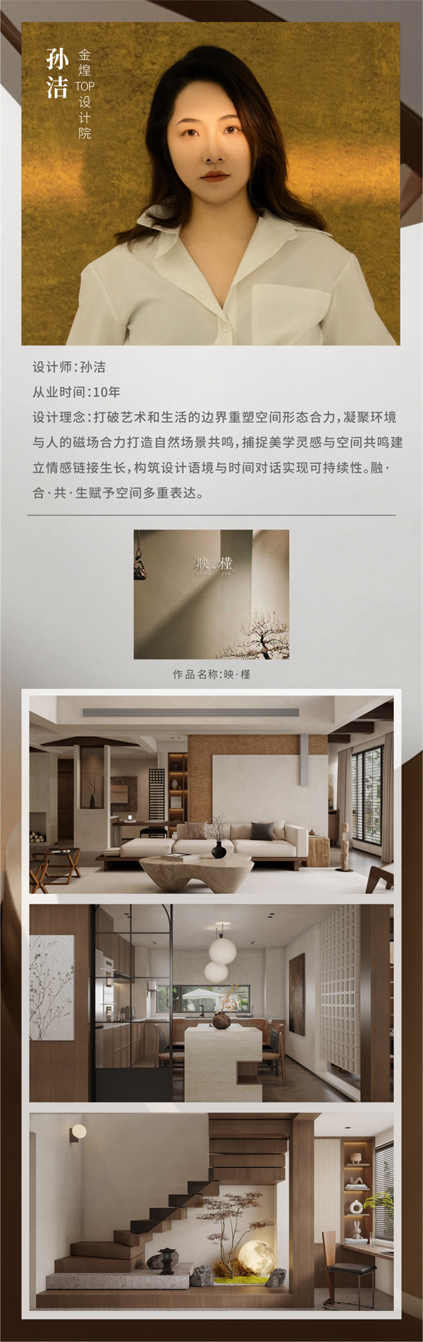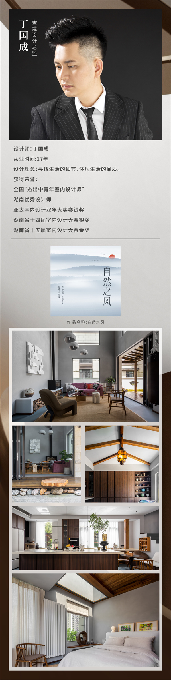 本次大賽以“綠色瀟湘·幸福湖南”為主題,金煌設計總監丁國成設計的住宅項目《自然之風》,金煌TOP設計院孫潔設計的麓云國際別墅項目獲得金獎;金煌首席設計師鄭全禧設計的會所項目九韻臺球俱樂部獲得銅獎;孫潔設計的住宅項目《映?槿》獲得優秀獎。橙果墅裝主理人孫香設計的住宅項目《幽幽歲月》獲得金獎,《明暗至簡》獲得銅獎。金煌也喜獲優秀組織獎。