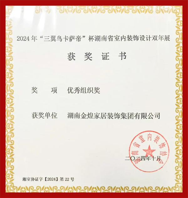 日前,由湖南省室內裝飾協會主辦、協會設計專業委員會、各市州室內裝飾協會和相關院校承辦,海爾智家湖南分公司協辦的2024年 “三翼鳥卡薩帝”杯湖南省室內裝飾設計雙年展頒獎典禮在長沙舉行。金煌滿載而歸,共斬獲3個金獎、2個銅獎、1個優秀獎。