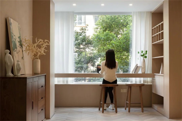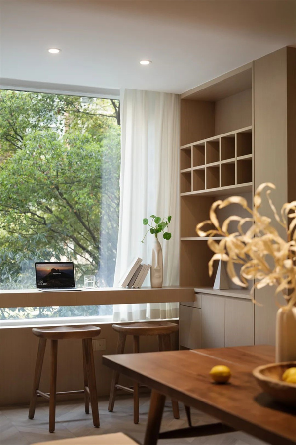 陽臺納入客廳,靠窗的一邊設計有書柜、書桌,空間足夠收納書籍和雜物。書臺上的綠植顯得格外清新素雅,稚嫩的枝丫,呈現出別樣的東方韻味。