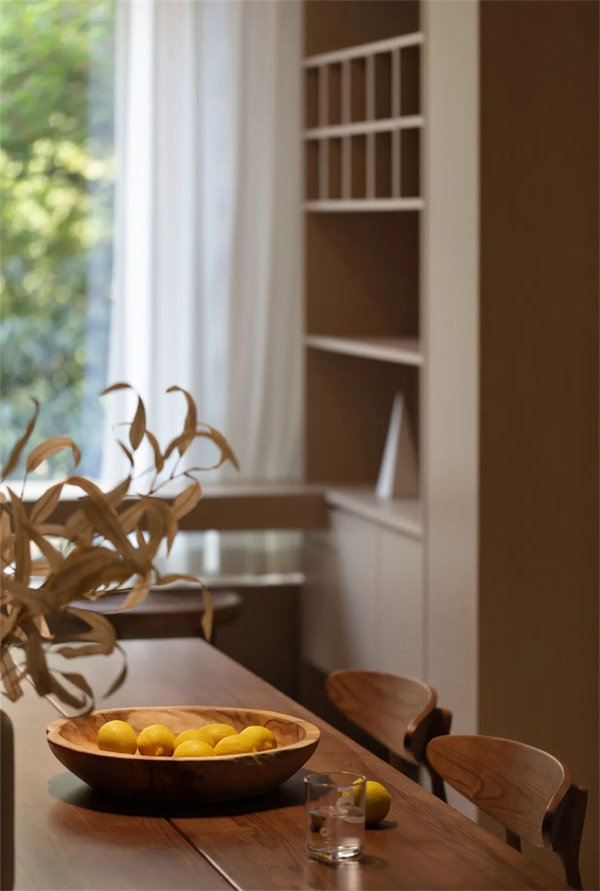 餐廳的設計同樣延續了侘寂的美感。原木色的餐桌搭配簡約的椅子,沒有多余的裝飾,只有一束采自院子的不知名花草,顯得樸素而自然。