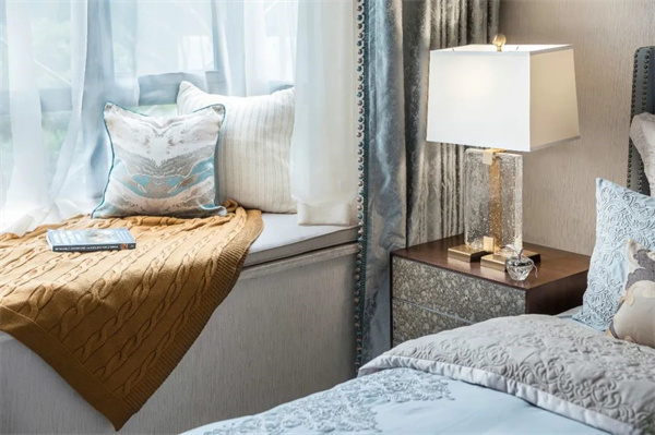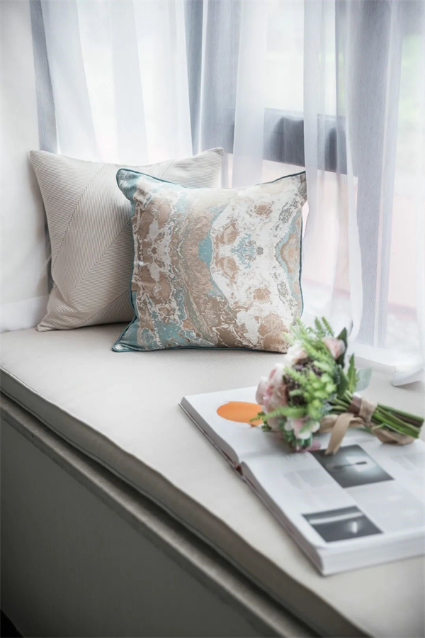 主臥中,優(yōu)雅與奢華交織成了一幅夢(mèng)幻的畫(huà)卷。房間的主色調(diào)為柔和的米白色和天藍(lán)色,床頭采用軟包設(shè)計(jì),床上鋪設(shè)著絲綢質(zhì)地的天藍(lán)色床品,柔軟而光滑的觸感讓人沉醉其中,與花卉相互輝映,彰顯出典雅與細(xì)膩。