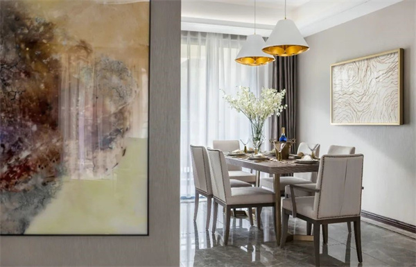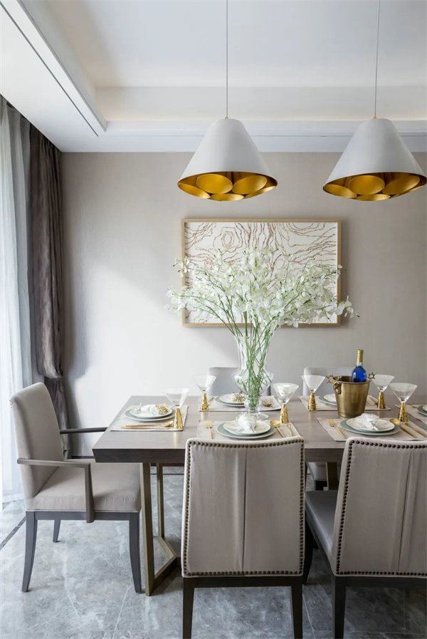 餐廳以淺色為主調(diào),中央擺放著一張長(zhǎng)方形仿木質(zhì)紋理的餐桌,桌面光滑細(xì)膩,散發(fā)出低調(diào)的奢華感。上方懸掛著一盞華麗的水晶吊燈,搭配桌上精心布置的金色餐具、細(xì)瓷餐盤以及充滿自然氣息的鮮花,營(yíng)造出溫馨而浪漫的用餐氛圍。