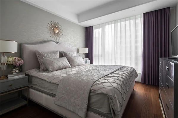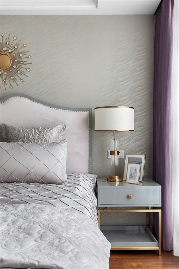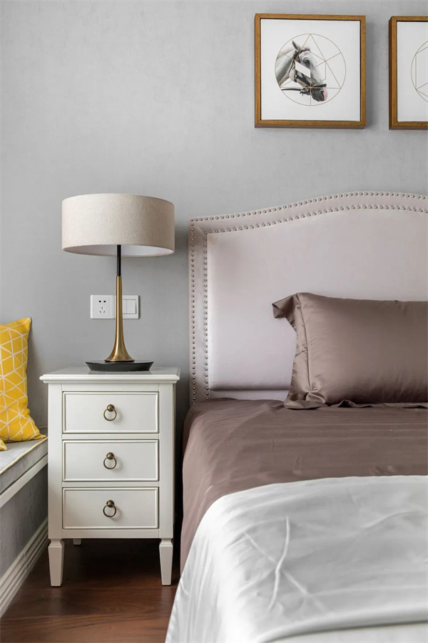 主臥采用淺色調,以米白和灰為主,打造出溫馨的氛圍。床頭背景墻采用精致的軟包裝飾,增添層次感。軟裝以高質感的面料為特色,搭配一些金屬工藝的家居裝飾,呈現出簡約中不失品質的輕奢感。