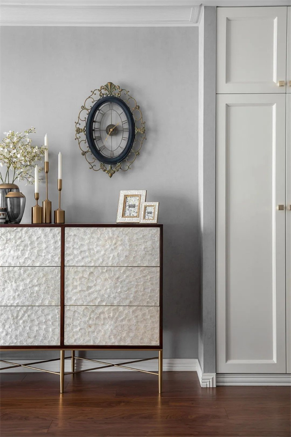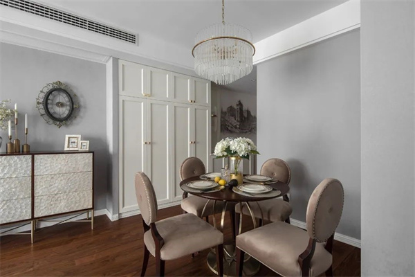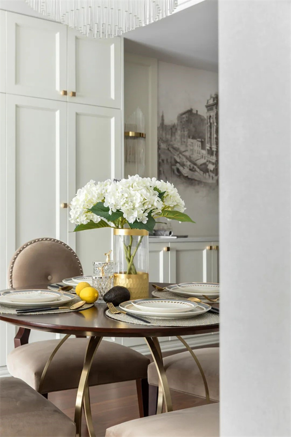 餐廳原木餐桌與布藝餐椅搭配精致的金屬吊燈,使餐區充滿現代感。餐邊柜上擺件和藝術鐘作為點綴,讓整個空間更具藝術氛圍。餐具的選擇注重精致和品質,搭配上鮮花裝飾,既簡約又不失奢華。