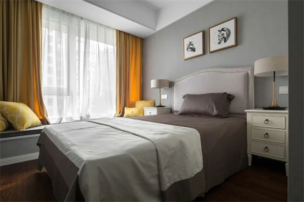 次臥以柔和的中性色調為主,搭配精致的金屬線條和獨特的軟包床頭,營造出優雅高級的溫馨氛圍。大面積的落地窗引入充足的自然光,窗簾則選用輕盈的絲質材質,增強通透感和舒適度,賦予空間獨特的優雅氣質。