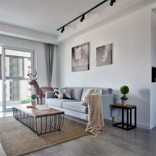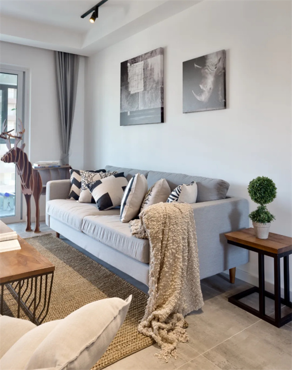 客廳整體采用了白色墻壁,使整個空間更加明亮和開放。灰色地磚增加了室內的深度和溫暖感。家具采用原木色,強調自然元素。舒適的灰色沙發和裝飾枕頭為客廳增添了溫馨感。墻上的裝飾物和藝術品展示著北歐設計的獨特元素,為空間增添了個性。