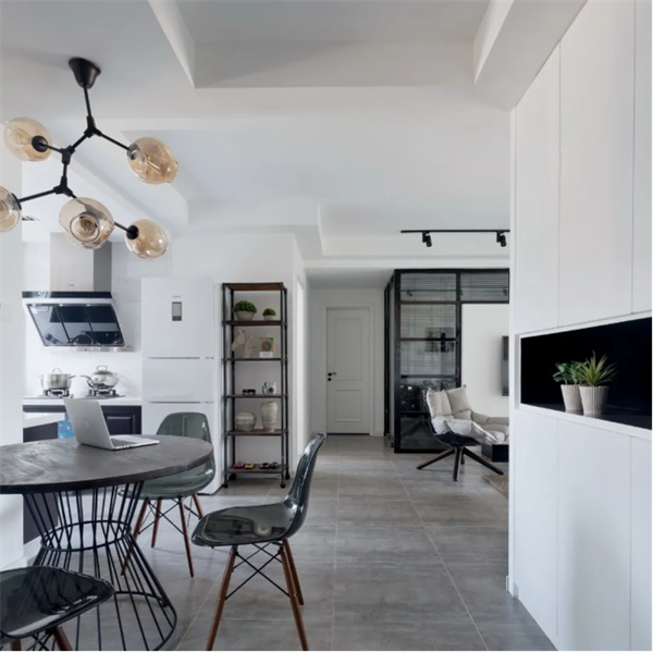 本案以灰色地磚和白色墻面為主要色調,創造了一個清新、溫馨的居住空間。此外,綠植、藤編等大自然的元素也被用來裝飾室內空間,讓整個家更加貼近自然,呈現出一個治愈系之家的感覺。