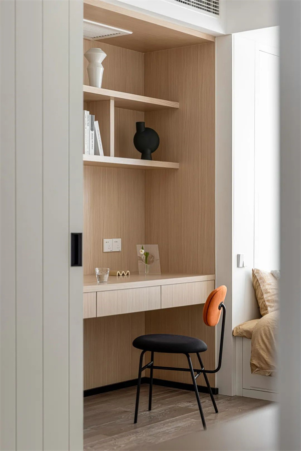 孩子房間以功能性與設(shè)計(jì)感并重,打造出一個(gè)充滿專注與創(chuàng)意的成長(zhǎng)空間。房間整體采用明亮的中性色調(diào),開放式書架,搭配柔和的燈光結(jié)合自然采光,保護(hù)視力的同時(shí),讓空間更加舒適。
