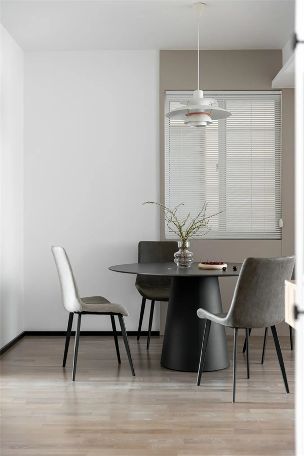 餐廳與客廳相連,采用了開放式布局。這個(gè)設(shè)計(jì)充滿層次感,也起到了引導(dǎo)公共空間的視覺效果。以餐桌為中心,打造了流動(dòng)而舒適的空間布局,搭配頂面吊燈,以柔和的燈光營(yíng)造出舒適的用餐氛圍。