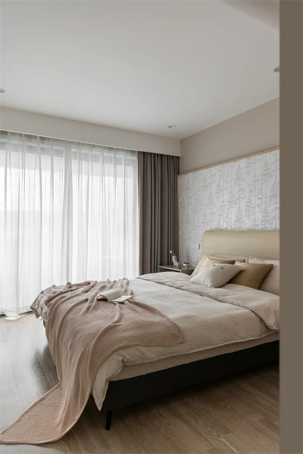 臥室墻面采用柔和的中性色調(diào),搭配極簡(jiǎn)的線條裝飾,讓人一踏入便感受到放松與安寧。簡(jiǎn)約設(shè)計(jì)的木質(zhì)床,搭配柔軟的床品,帶來舒適的睡眠體驗(yàn)。床頭的壁燈與小巧的床頭柜,既注重功能性,又增添了一抹時(shí)尚的設(shè)計(jì)感。