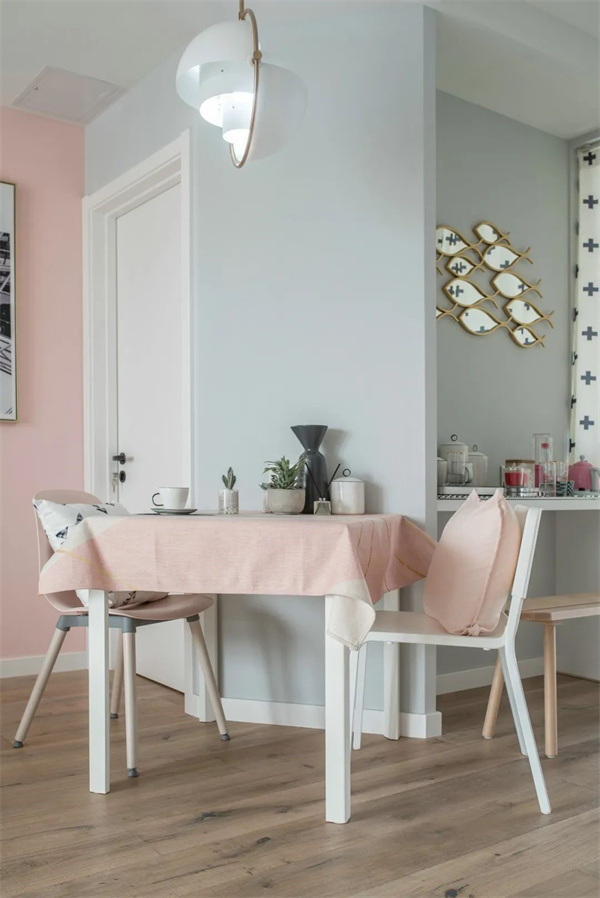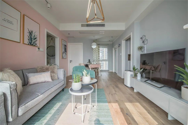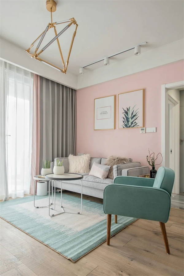 客廳墻壁采用粉色和天藍色的巧妙組合,這種色彩搭配不僅增添了空間的層次感,還帶來了一種溫暖與寧靜的對比美,兩者相互映襯,營造出一種既溫馨又清爽的視覺效果。