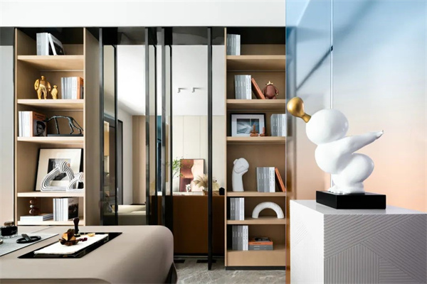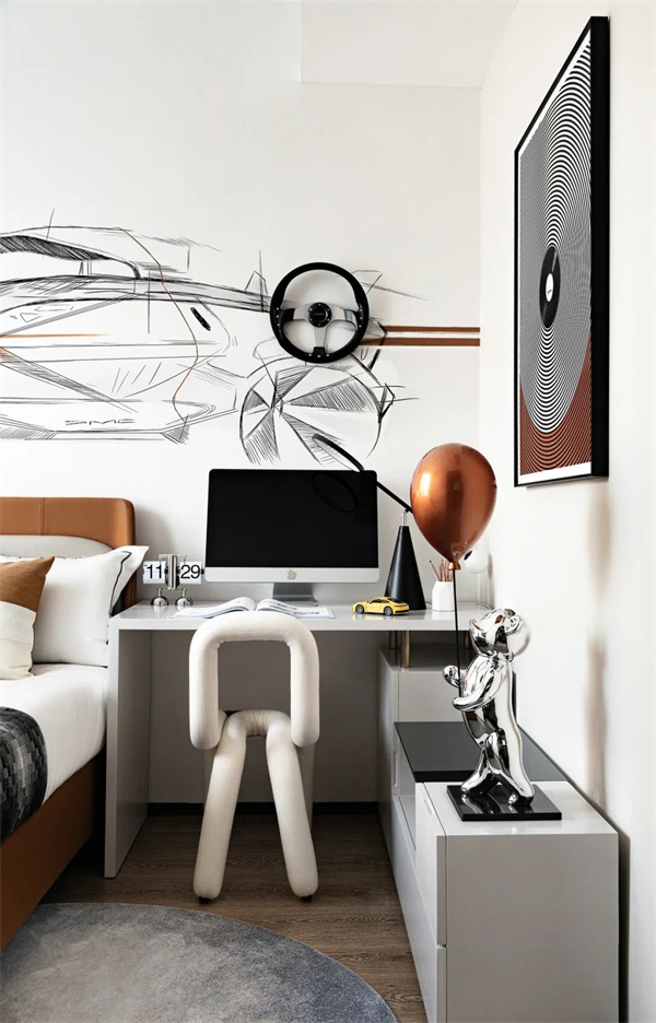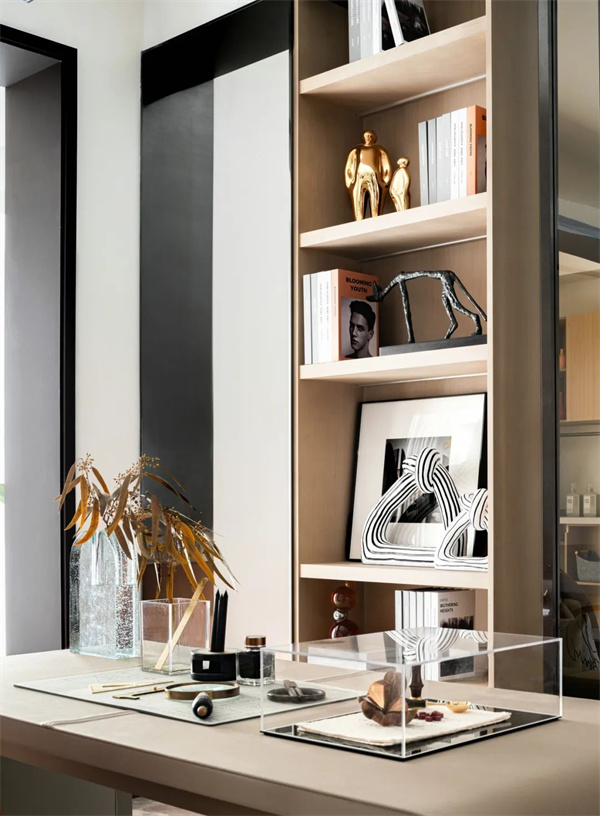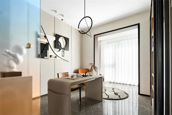 書房整體以中性色調為主,墻面的幾何裝飾增強空間層次感,書桌與椅子設計考究,既注重人體工學,又散發現代美學的魅力。溫暖的燈光與自然光線交織,營造舒適的閱讀和工作的氛圍。