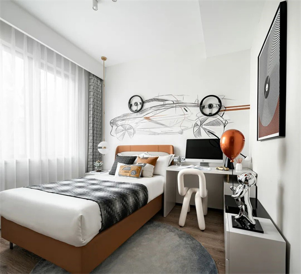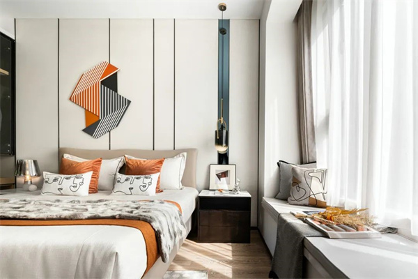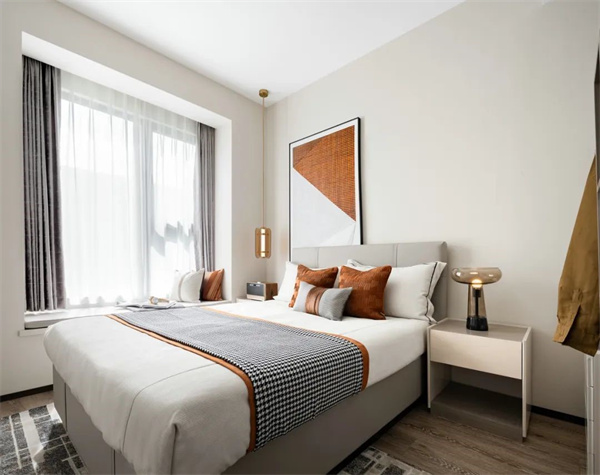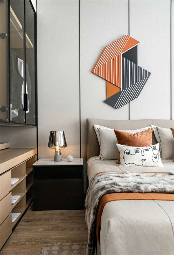 次臥色調選擇偏暖的色調,營造溫馨氛圍,同時以金屬吊燈裝飾細節增添奢華感,搭配柔軟的床品,盡享放松時刻。簡潔的床頭柜和裝飾畫擴展空間,既體現美感又不失實用。