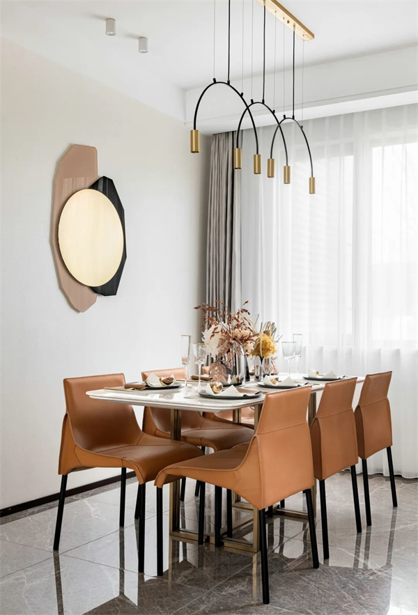 餐廳延續客廳風格,搭配金屬質感的餐桌椅,彰顯低調的奢華品味。桌面點綴精致的餐具與裝飾品,吊燈則以獨特的藝術造型設計,賦予空間溫暖柔和的光影效果,讓每一次用餐都充滿格調與美好。