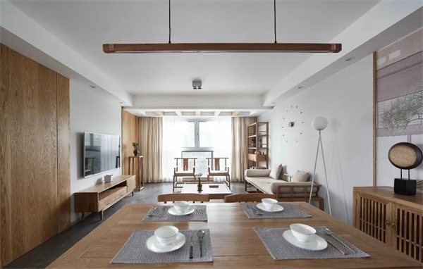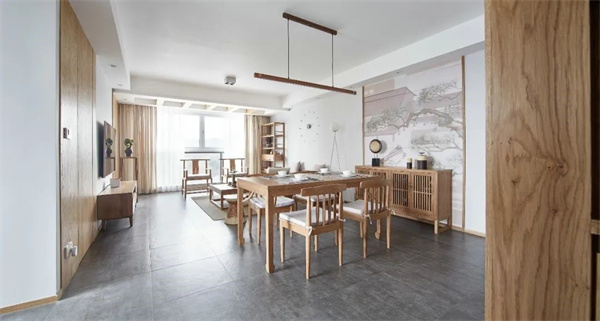 原木餐桌和椅子在餐廳中獨具焦點,天然的木紋質(zhì)感散發(fā)著獨特的自然之美,吊燈采用木質(zhì)和金屬的巧妙搭配,既展現(xiàn)現(xiàn)代感又保留溫暖氛圍。