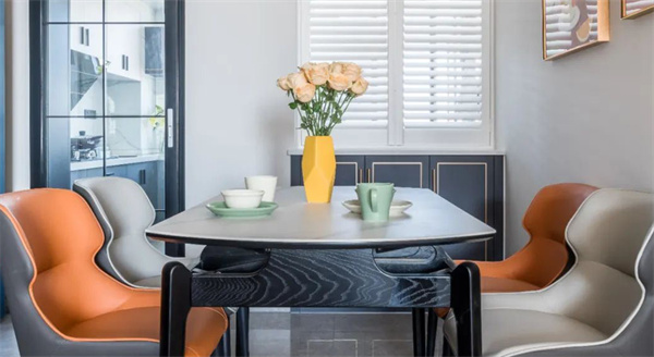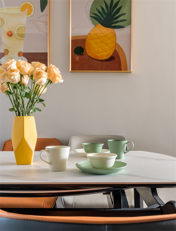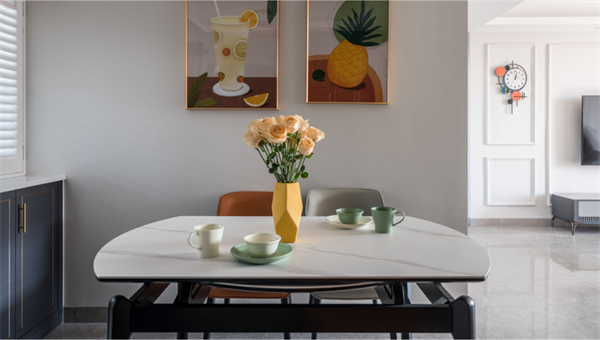 餐廳是家中最浪漫的一隅,承載著三餐四季。裝飾畫和金屬吊燈搭配,顯得餐廳的設計更加有品位有情調。暖色餐桌椅組合,搭配桌面上的杯碟與花瓶,營造出浪漫精致的用餐氛圍。