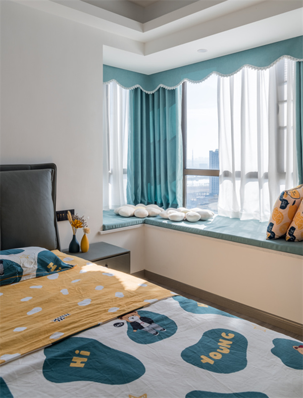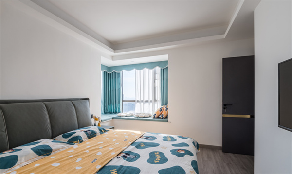 臥室灰色的皮藝床與床頭留白的墻面相輝映,搭配藍白相間的床品和天藍色窗簾,整體顯得素雅而又舒適大氣。在飄窗上看看書/曬曬太陽/吸吸貓或者躺著放空睡一覺,也不失為一個美好的下午。