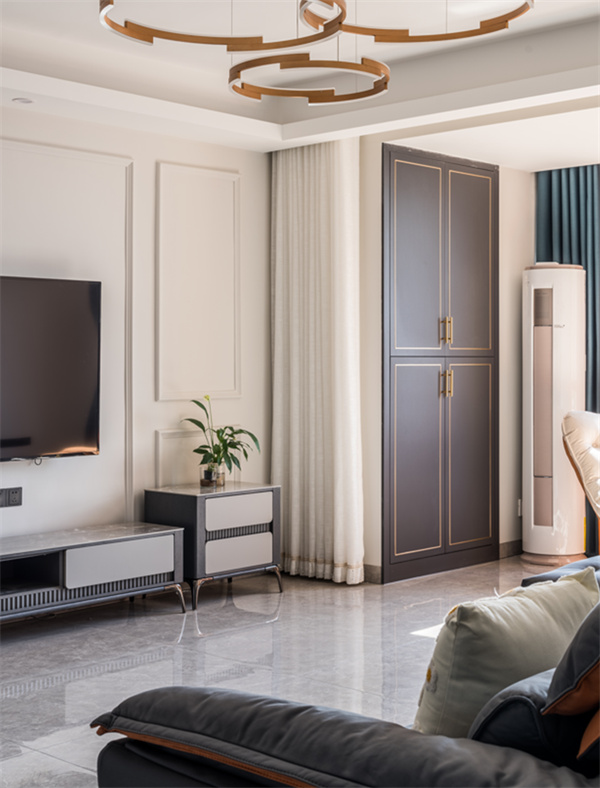 客廳灰色地磚與簡潔墻面空間結合,搭配灰色皮藝沙發,而電視墻則是以白色飾面板為背景,壁掛上電視機,呈現出簡潔大方的格局。陽臺上色彩明亮的窗簾搭配暖色布藝沙發,帶來的是簡約的優雅空間感,縱享愜意時光。