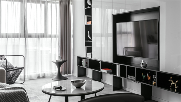 客廳墻壁和天花板都采用純白色裝飾,設(shè)計師巧妙地運(yùn)用了黑白相間的電視背景墻,增添了一絲現(xiàn)代感和視覺層次感。寬大的窗戶將自然光線引入室內(nèi),中性色的大理石地板為空間增添了質(zhì)感和豪華感。