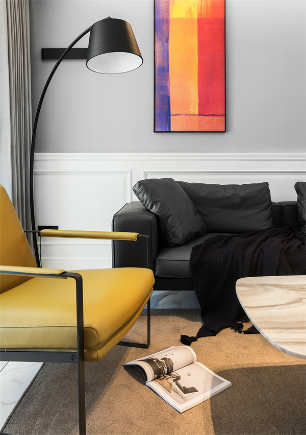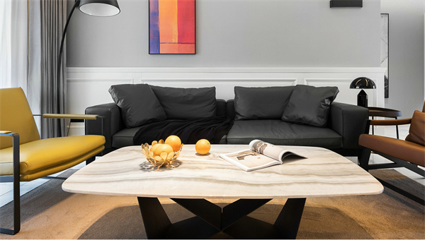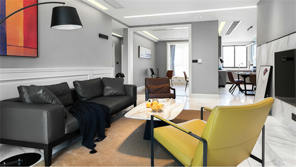 客廳主色調,采用灰白墻面與白色大理石地磚搭配,創(chuàng)造出通透明亮的空間感。以低調的深色調沙發(fā)展現簡約品味,通過精致的極簡設計裝飾畫和空間擺件,為整個客廳注入一絲藝術氛圍。
