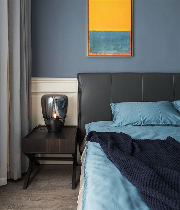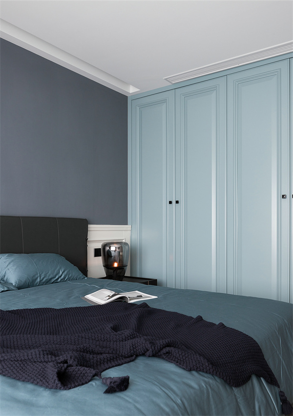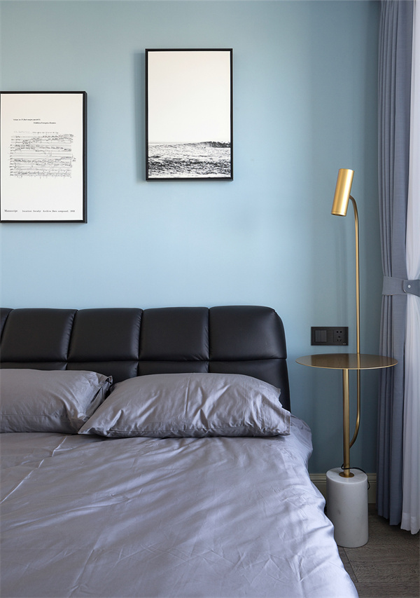 主臥極簡的設計語言,白色和淺灰色墻面搭配木色地板,突顯整體空間的清新與寬敞感。床品選擇了高質感的純棉,搭配一些柔和的裝飾枕,營造出溫馨的氛圍。簡約的床頭柜和燈具設計,為主人帶來舒適輕松的睡眠空間。