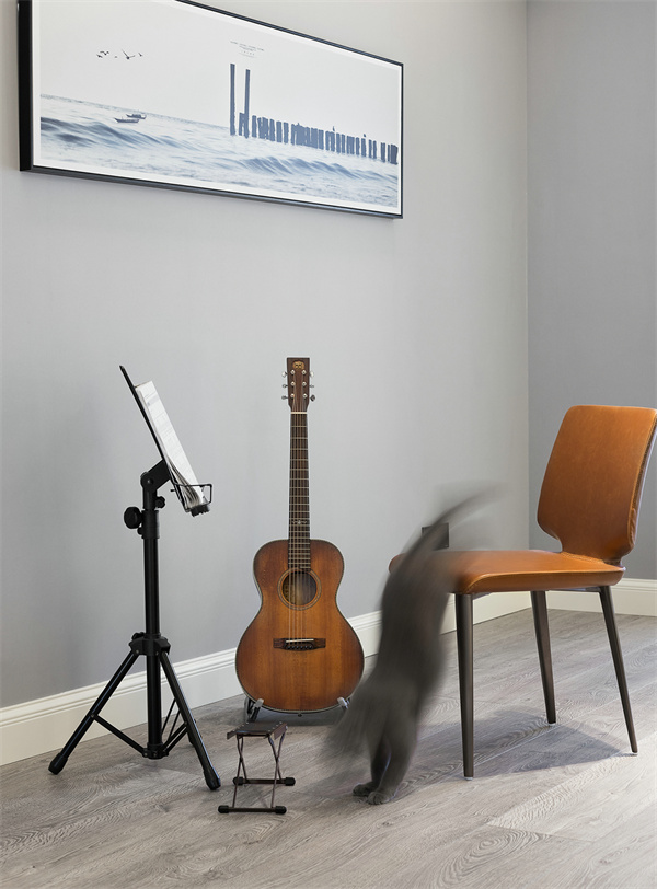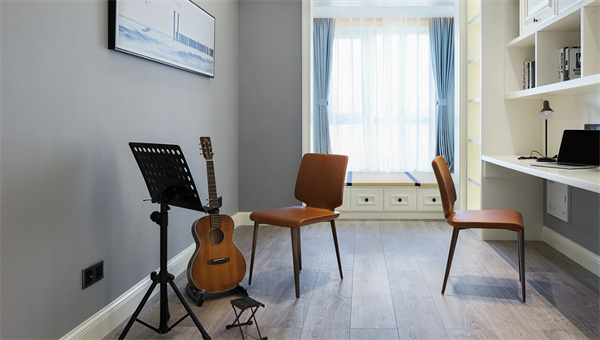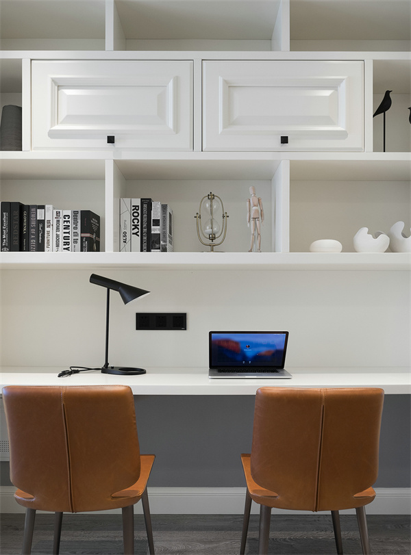 現代簡約的書房注重實用性和整體協(xié)調性,純白書桌和書架組合打造出一個明快而整潔的學習空間。舒適的椅子、明亮的臺燈以及一些簡約的掛畫與樂器,讓這個空間兼具工作與休閑的功能。