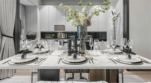 餐廳延續(xù)客廳的風格,將定制柜的美觀與實用性發(fā)揮得淋漓盡致。現(xiàn)代感十足的燈具將溫暖的光線投射到大理石餐桌和布藝餐椅上,營造出舒適的用餐氛圍。開闊的陽臺風格和清新的綠植更是為餐廳增添自然美景。