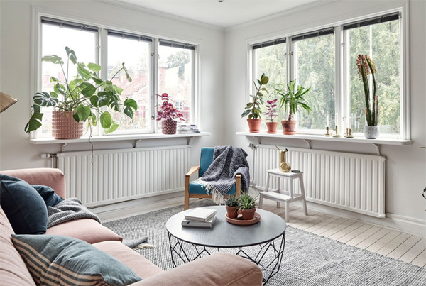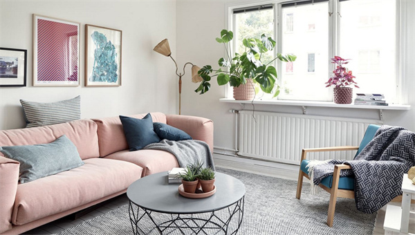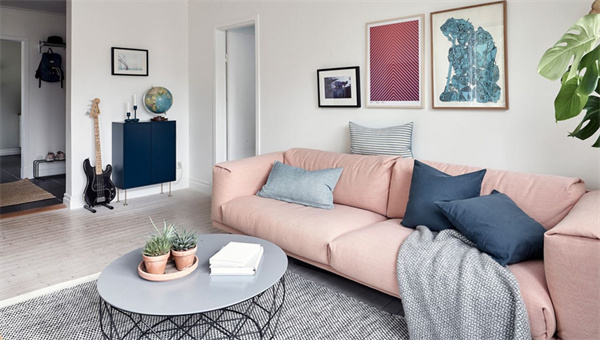 客廳白色的墻面與自然木色的家具相映襯,打造出明亮寬敞的空間。一組粉色布藝沙發與柔軟的地毯搭配,營造出舒適宜人的氛圍。