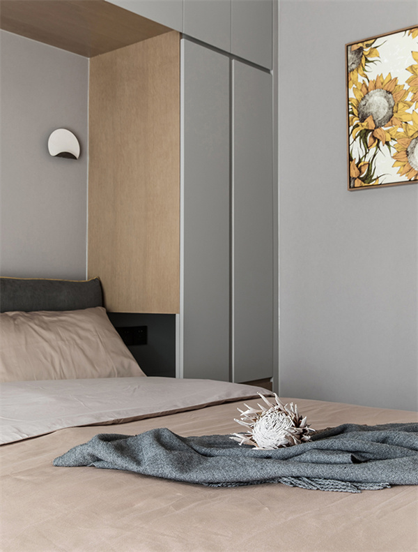 次臥延續(xù)整體風(fēng)格,以白色為主色調(diào),營造出寧靜的氛圍。墻面和窗簾都是白色+淡灰色組合,一張簡約而舒適的雙人床與整套原木床頭柜設(shè)計(jì)相配,增添了自然質(zhì)感。