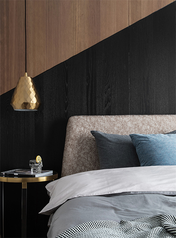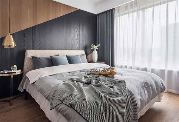 臥室整體布局簡潔明快,為休息提供舒適的環(huán)境,特別是原木色與黑色相拼接設(shè)計(jì)的床頭背景墻,給整個(gè)空間增添了現(xiàn)代感和品味。在優(yōu)秀的采光條件下,窗簾選用白色透明面料,確保充足的自然光線進(jìn)入房間。