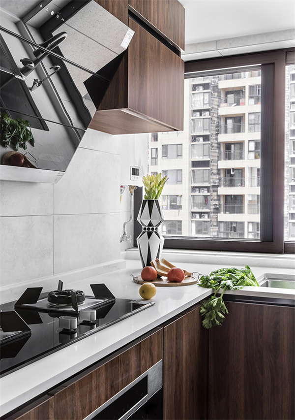 廚房采用現(xiàn)代設(shè)計(jì)的灰白+原木色搭配方案。櫥柜選用原木色柜面和白色臺面組合,搭配嵌入式電器,創(chuàng)造出極簡的外觀。同時(shí),灰白組合的地磚與墻面,也為廚房空間增添了質(zhì)感。